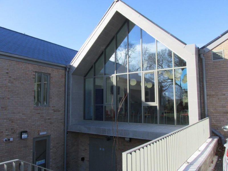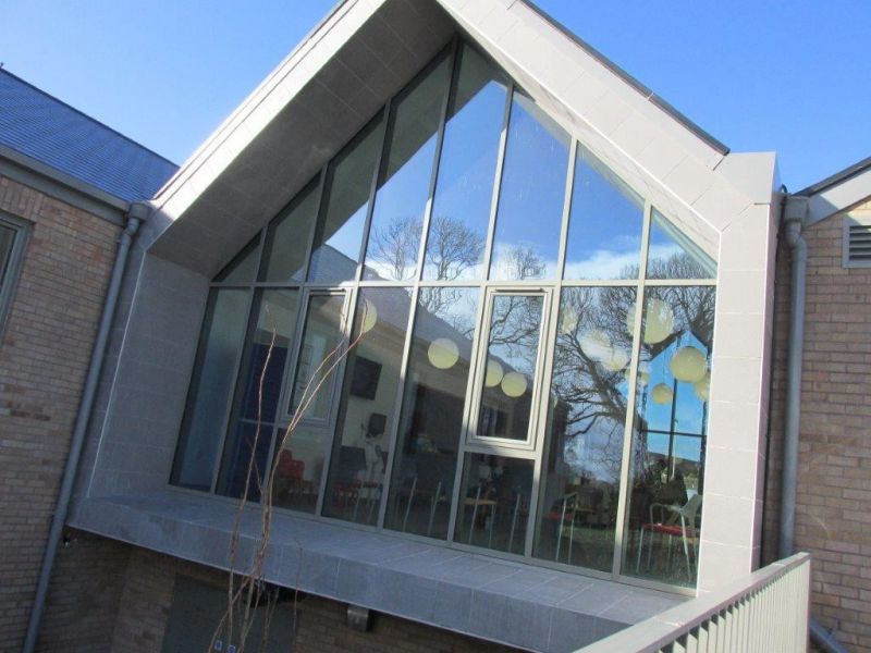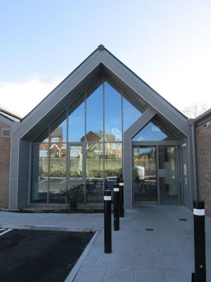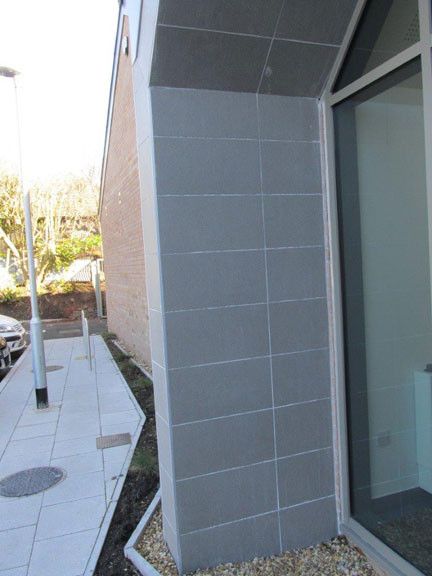 Porcelain Tiles Mechanically fixed to Plywood Background to Front & Rear Elevations, both over 4m High.